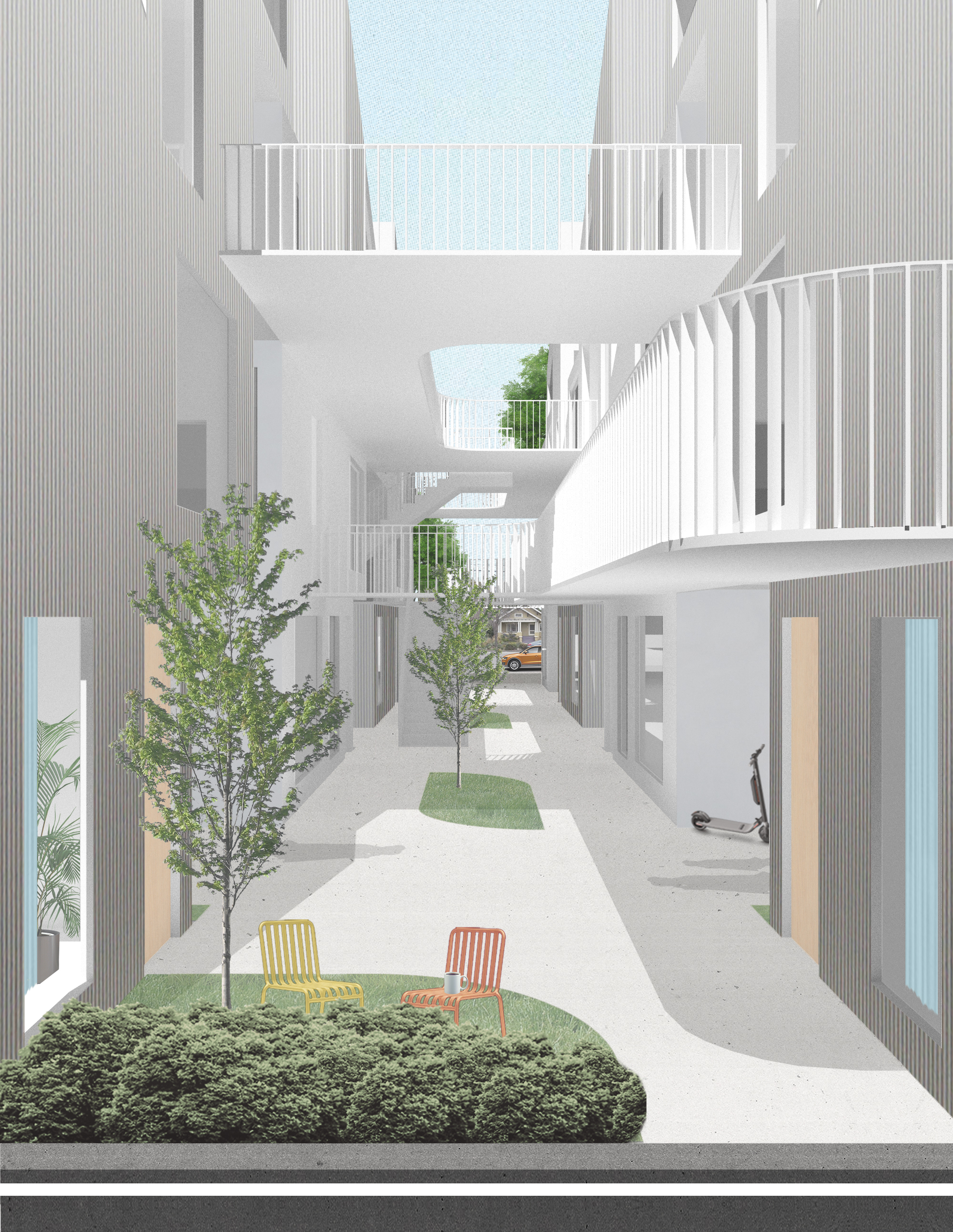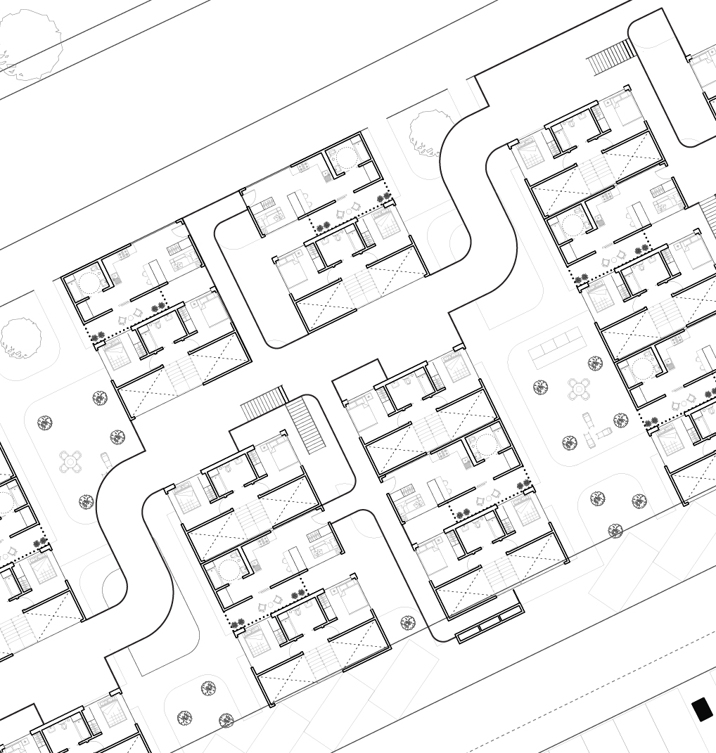The proposal hybridizes lofted units with apartment complex typologies to provide a variation of density that can exist in historically low density zones. With a configuration of five units that come together to complete a module, the design facilitates mini-communities that can provide double height living spaces and open-air circulation in each of its living quarters. Ancillary program, circulation, and site improvements are then infilled based on site specific needs.
